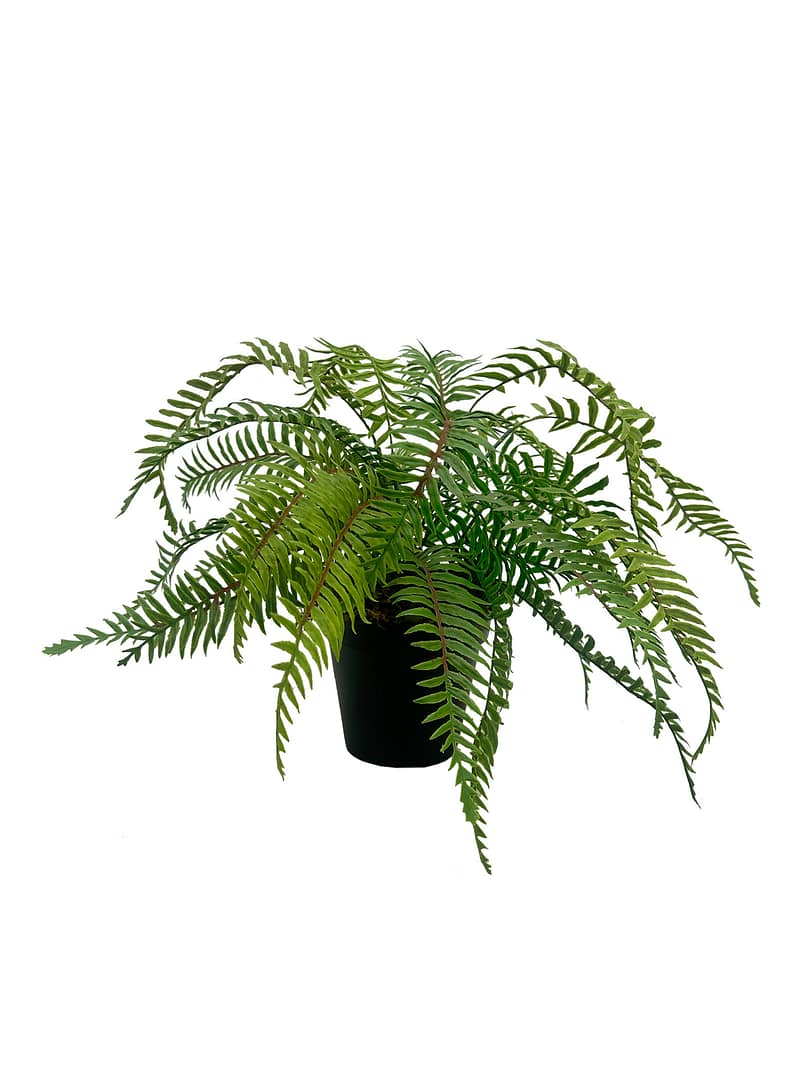 Enhance the aesthetic appeal of your living space with this elegant fern plant in a sleek black pot. The contrast between the lush green foliage of the fern and the modern black pot creates a striking visual impact that will instantly elevate any room in your home. Whether placed on a shelf, a side table, or as a centerpiece on your dining table, this plant is sure to add a touch of sophistication to your decor.