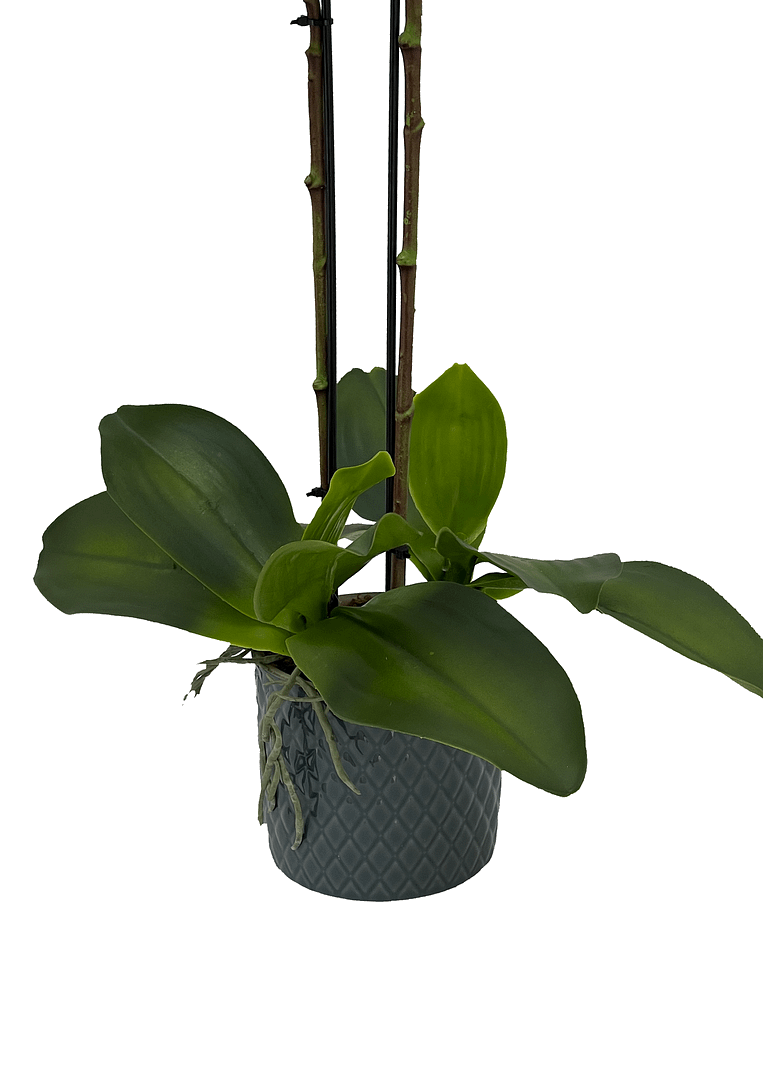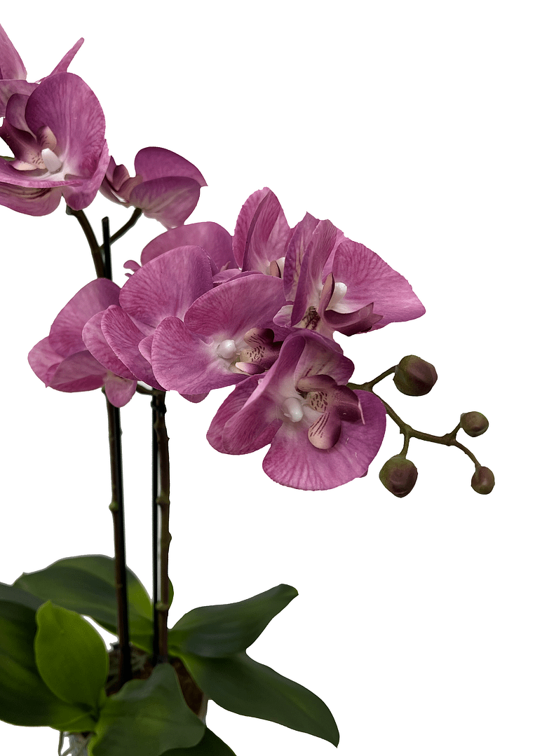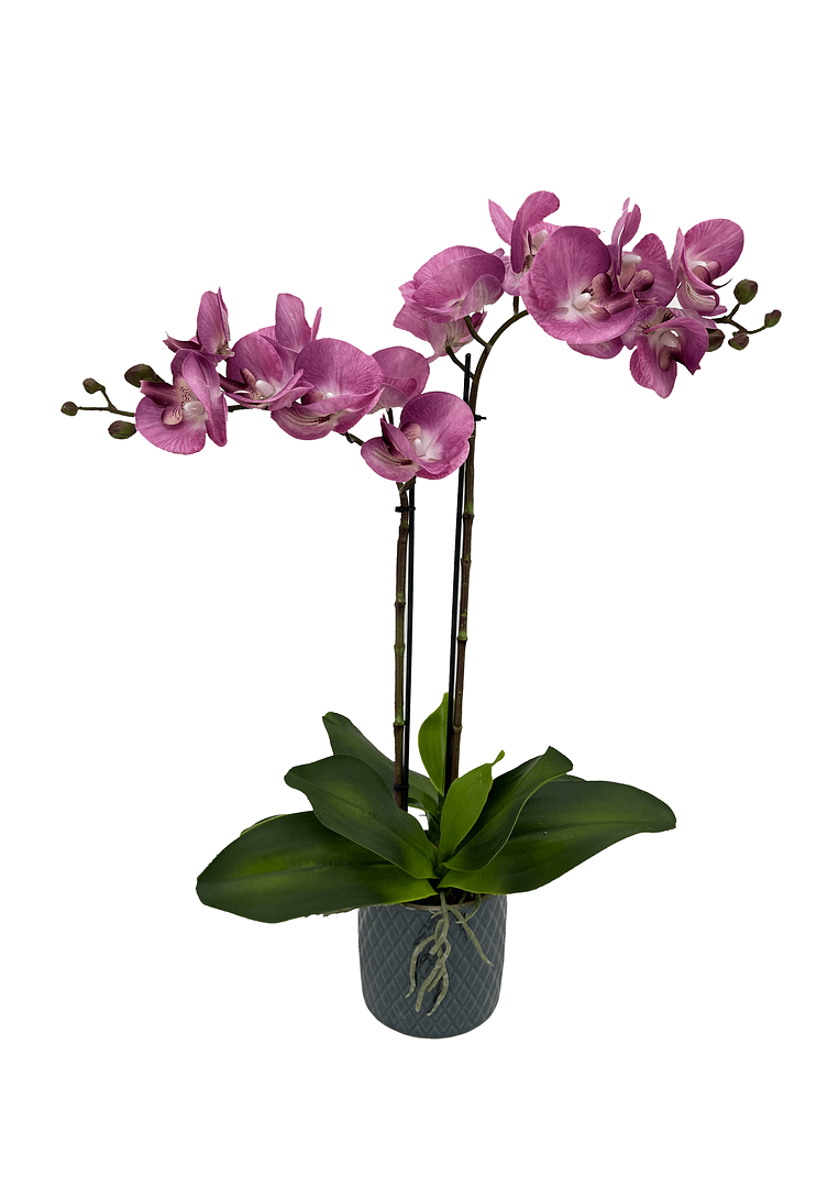 Introducing the stunning Scarlet Elegance purple orchid plant in a sleek ceramic pot. This elegant and vibrant plant is the perfect addition to any home or office space, adding a touch of sophistication and beauty to any room. The deep purple blooms of the orchid contrast beautifully with the modern ceramic pot, creating a striking visual display that is sure to impress.