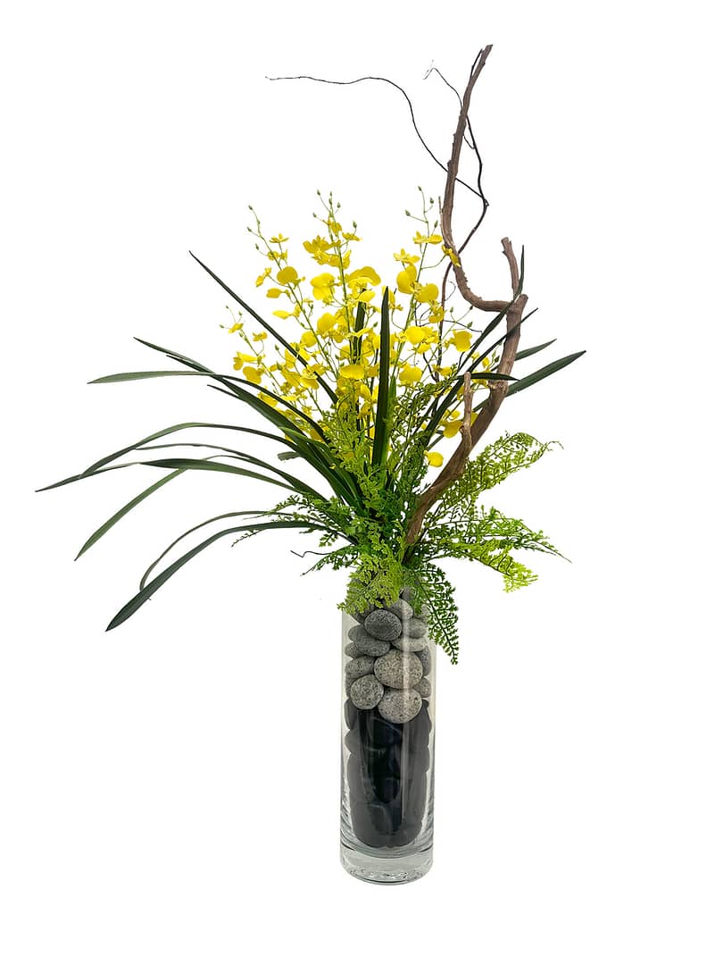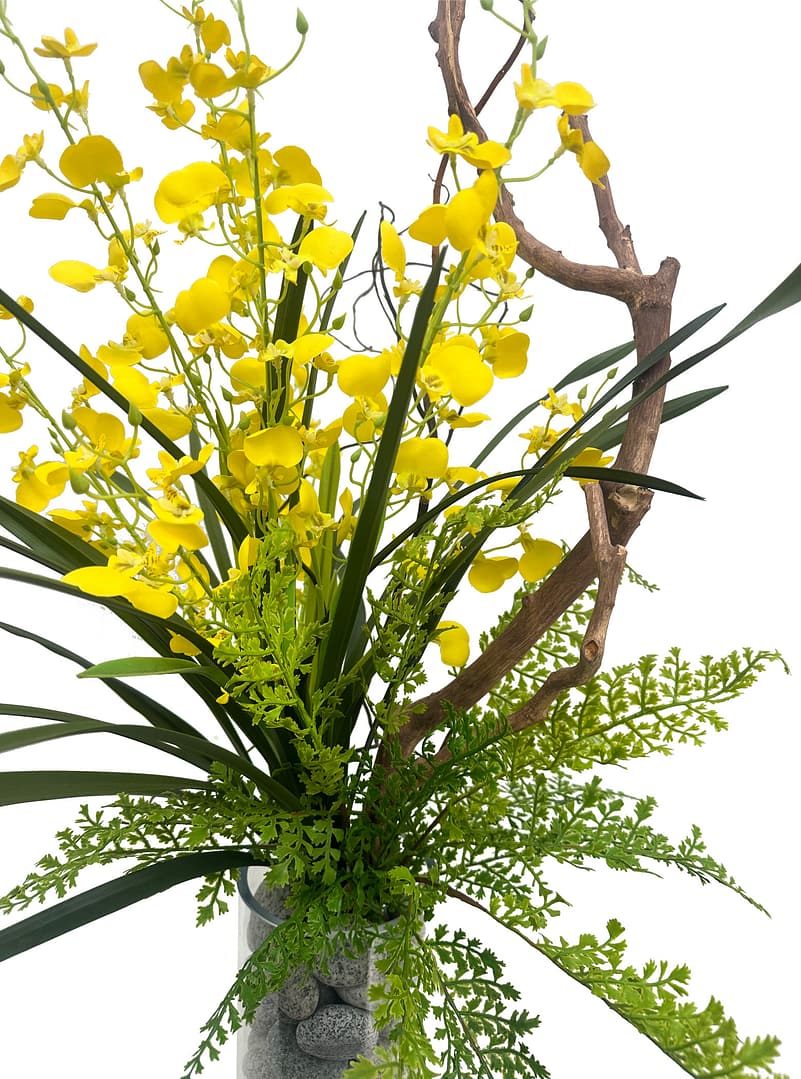 Introducing the “Shower of Sunshine” vase, a delightful addition to any home decor that will instantly brighten up your space. This exquisite vase features a stunning arrangement of vibrant yellow flowers and lush green plants, creating a captivating display of nature’s beauty. The combination of the sunny yellow blooms and the refreshing green foliage brings a sense of warmth and cheerfulness to any room, making it the perfect centerpiece for your living room, dining area, or even your office.