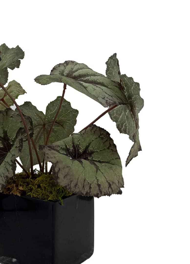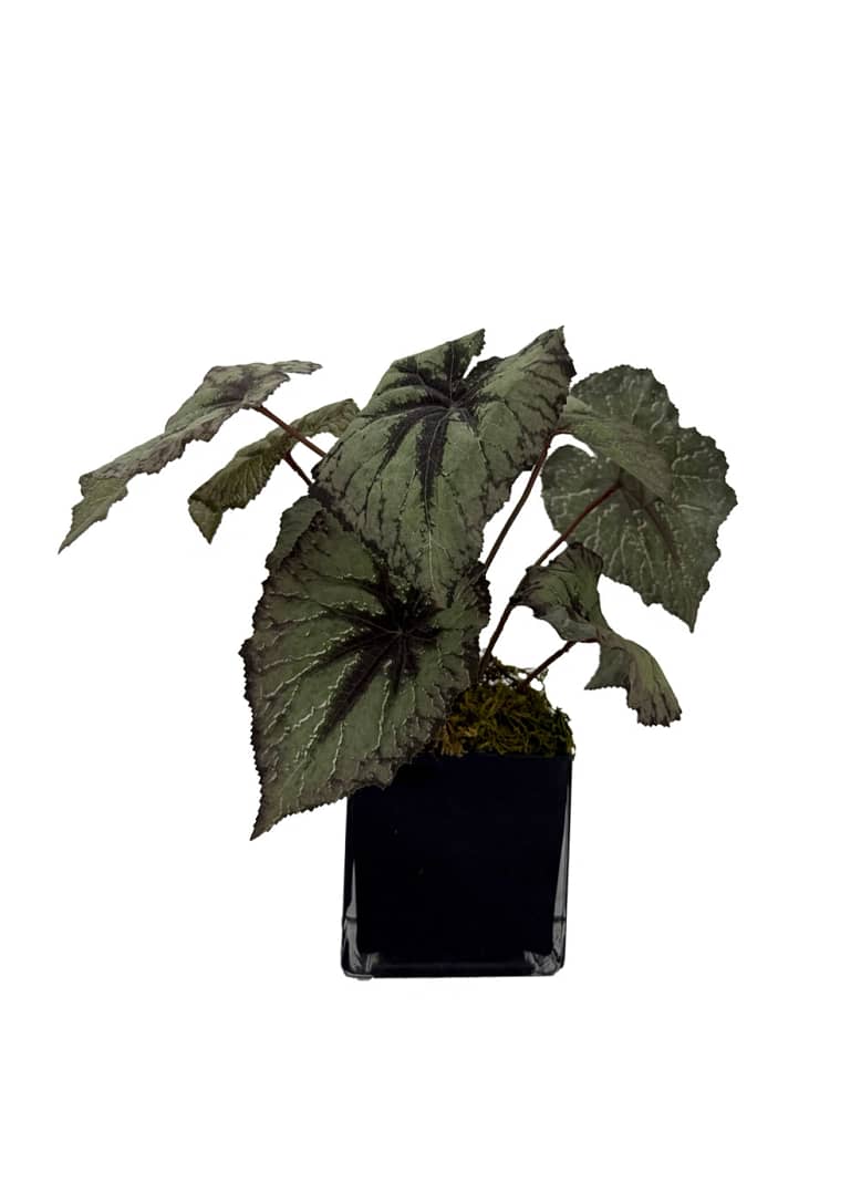 Elevate your space with the refined elegance of our Silver Veil Arrangement. Inspired by the intricate beauty of the Rex Begonia, this lifelike artificial plant boasts delicately veined, silvery-green leaves that create a stunning contrast. Set in a sleek black glass planter with a moss base, it’s a perfect blend of modern sophistication and natural charm. Ideal for home, office, or contemporary décor.