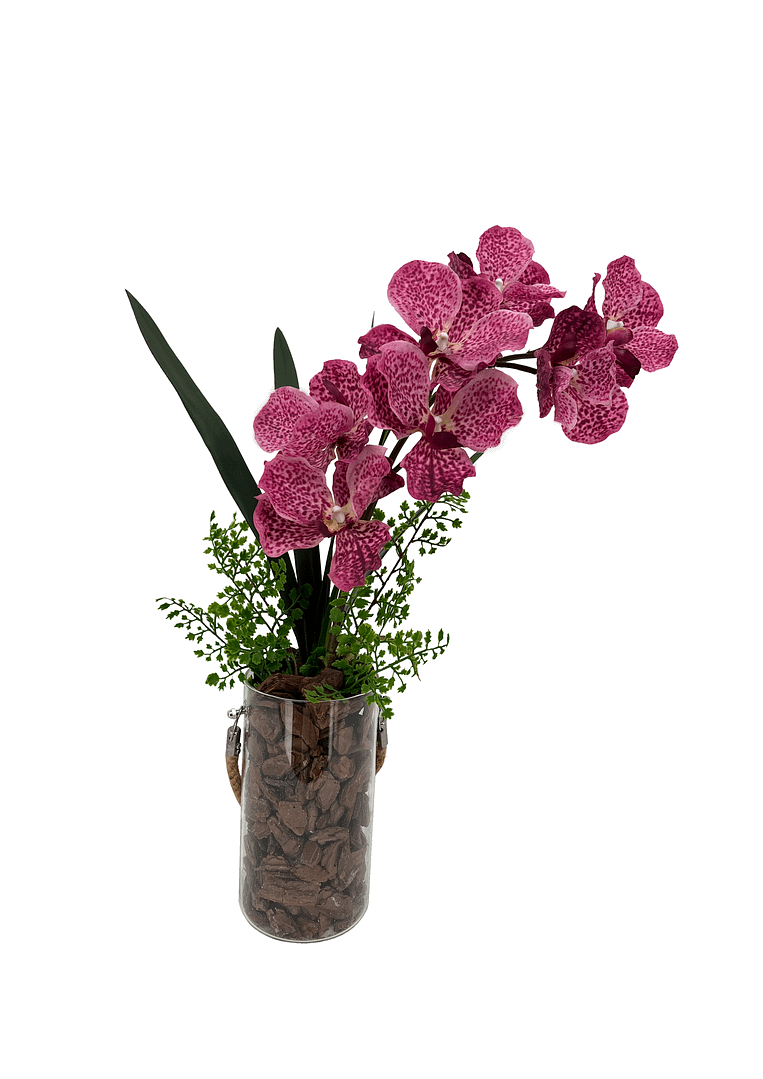 Elevate your space with the exquisite beauty of a violet orchid in a hanging vase. The vibrant purple bloom and lush green leaves create a stunning contrast, making it a perfect addition to any room. Bring a touch of elegance and tranquility to your home with this captivating arrangement.